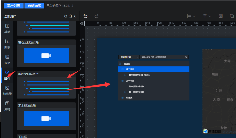 1、點擊左側控件欄,找到“組織架構與資產”并拖進畫布