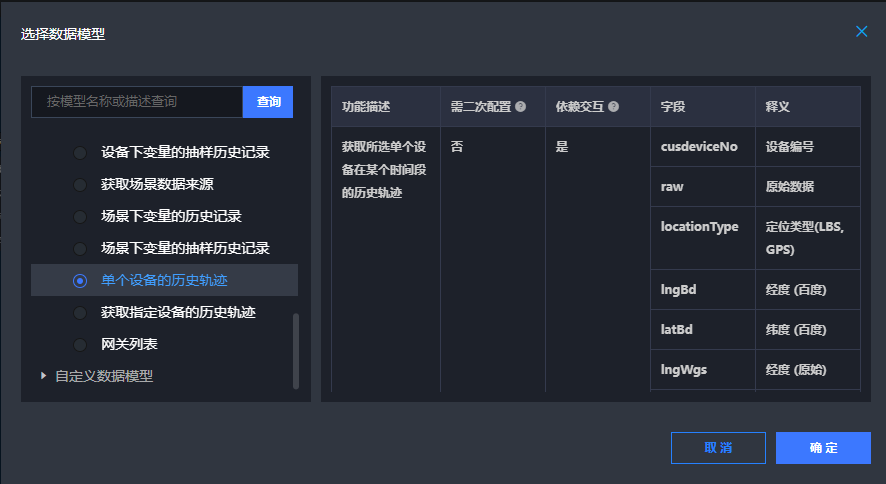 4、點擊地圖,在數據中綁定動態數據,選擇“單個設備的歷史軌跡”數據模型