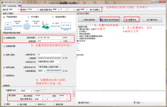 (1)設置之前必須將GPRS模塊的串口連接電腦的串口,然后用USR-GM3設置軟件V1.1.3.61設置參數。