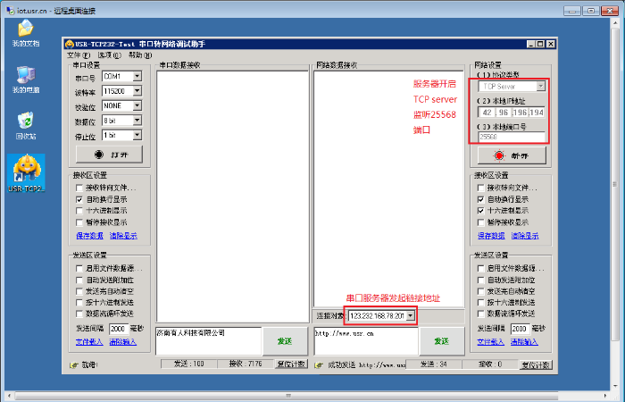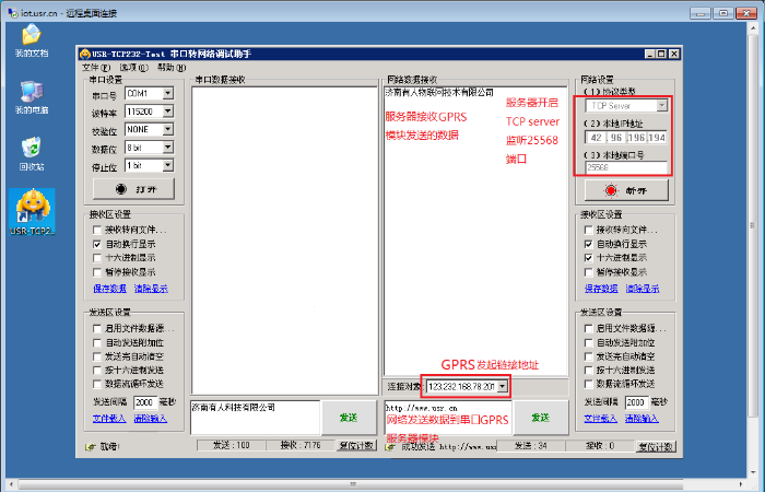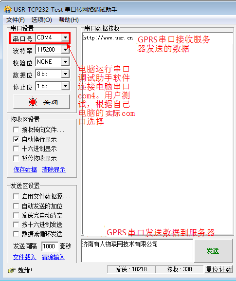 以上是服務器發送數據和接收數據:以下使用電腦串口連接GPRS-DTU串口,電腦運行串口調試軟件,進行發送和接收服務器的數據。