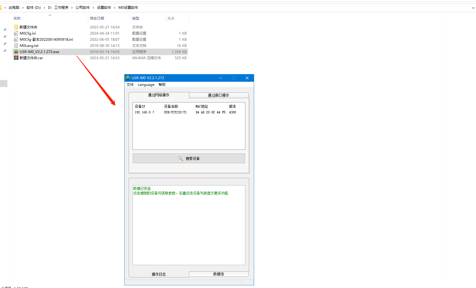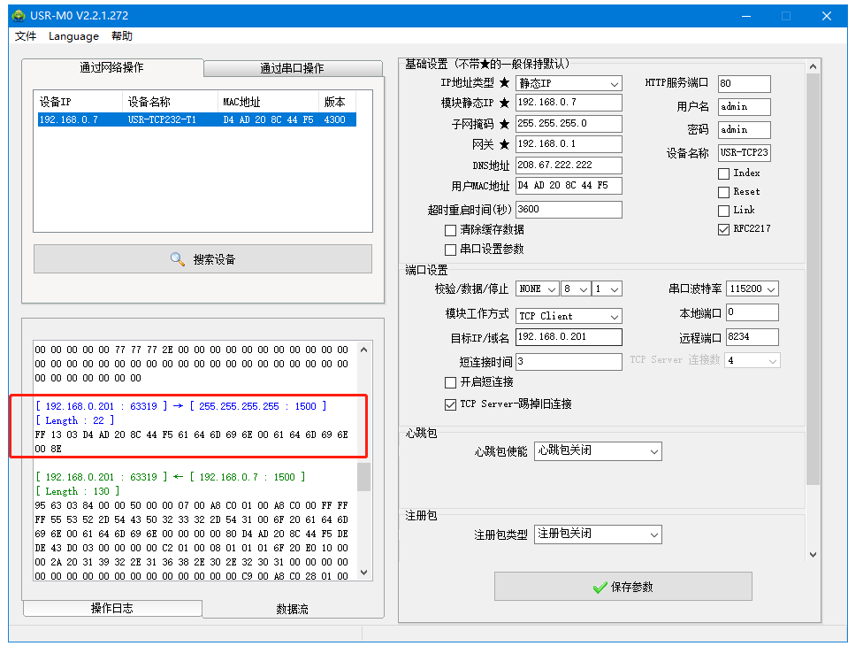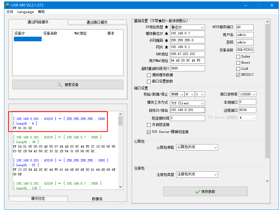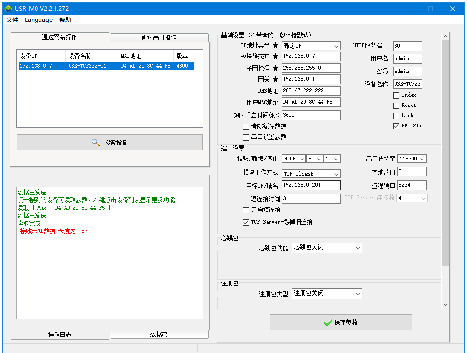 USR-TCP232-T1和電腦網線直連,打開M0軟件,搜到USR-TCP232-T1的IP。