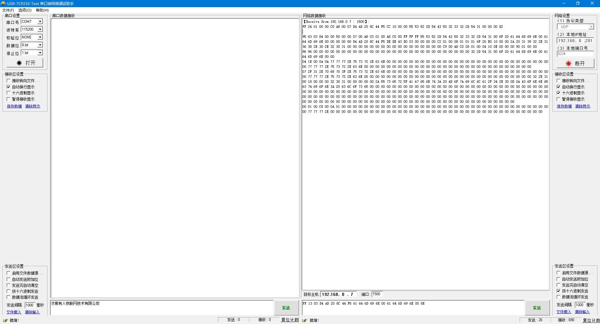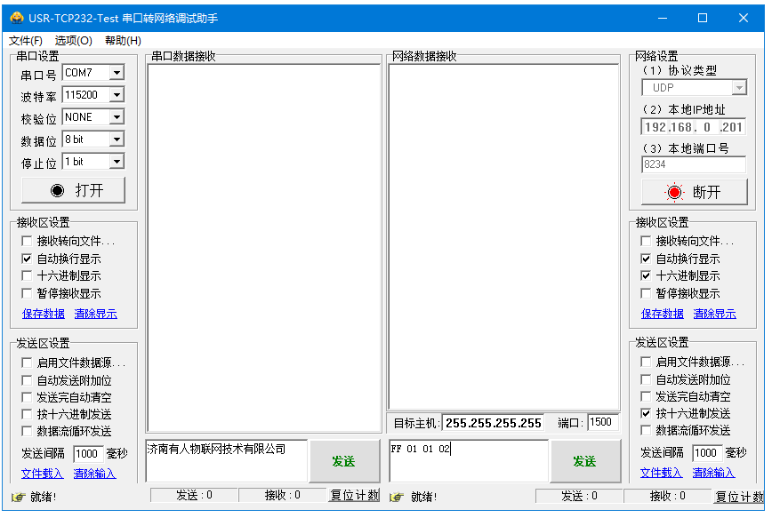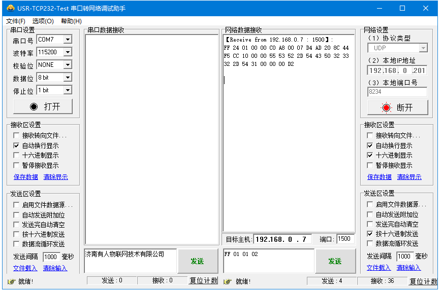 (1)網絡端勾選按十六進制發送,輸入搜索指令,FF 01 01 02