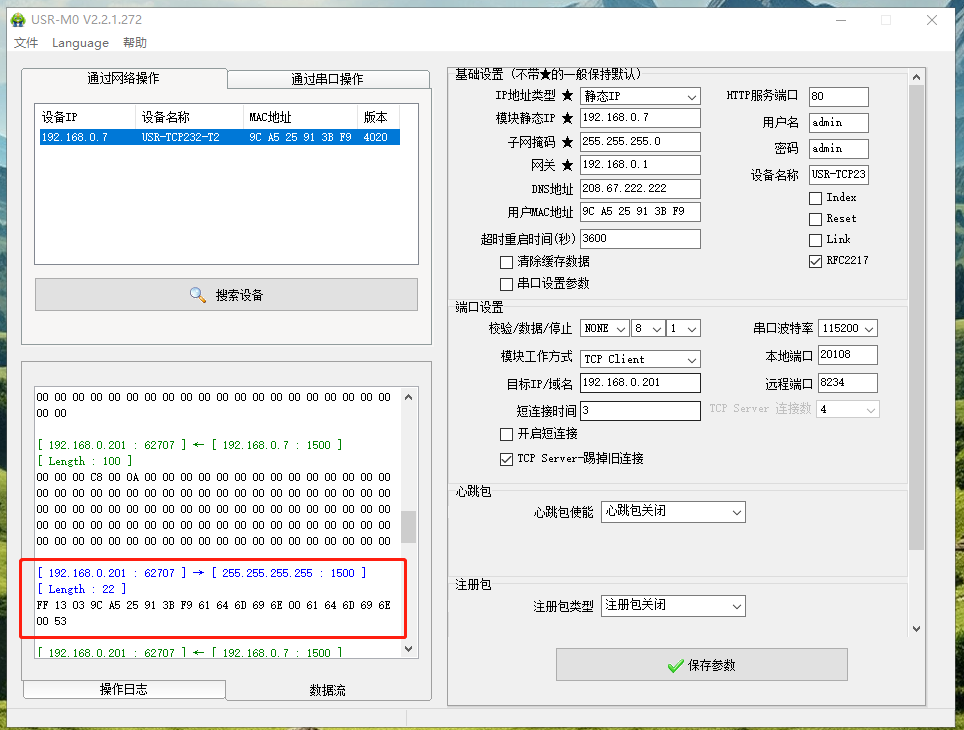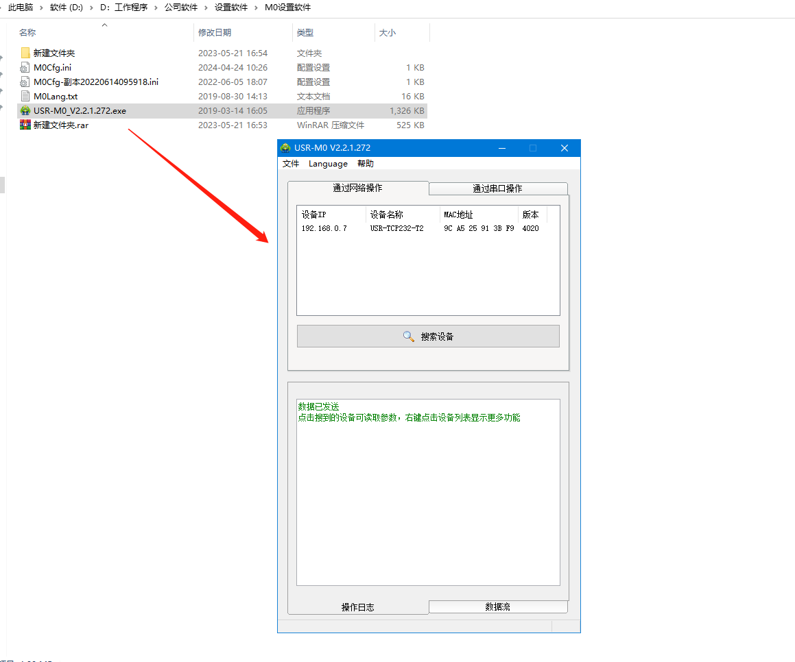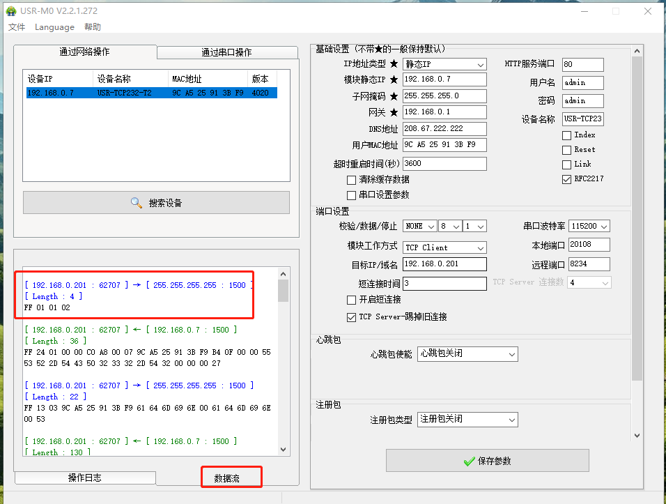 USR-TCP232-T2和電腦網線直連,打開M0軟件,搜到USR-TCP232-T2的IP。