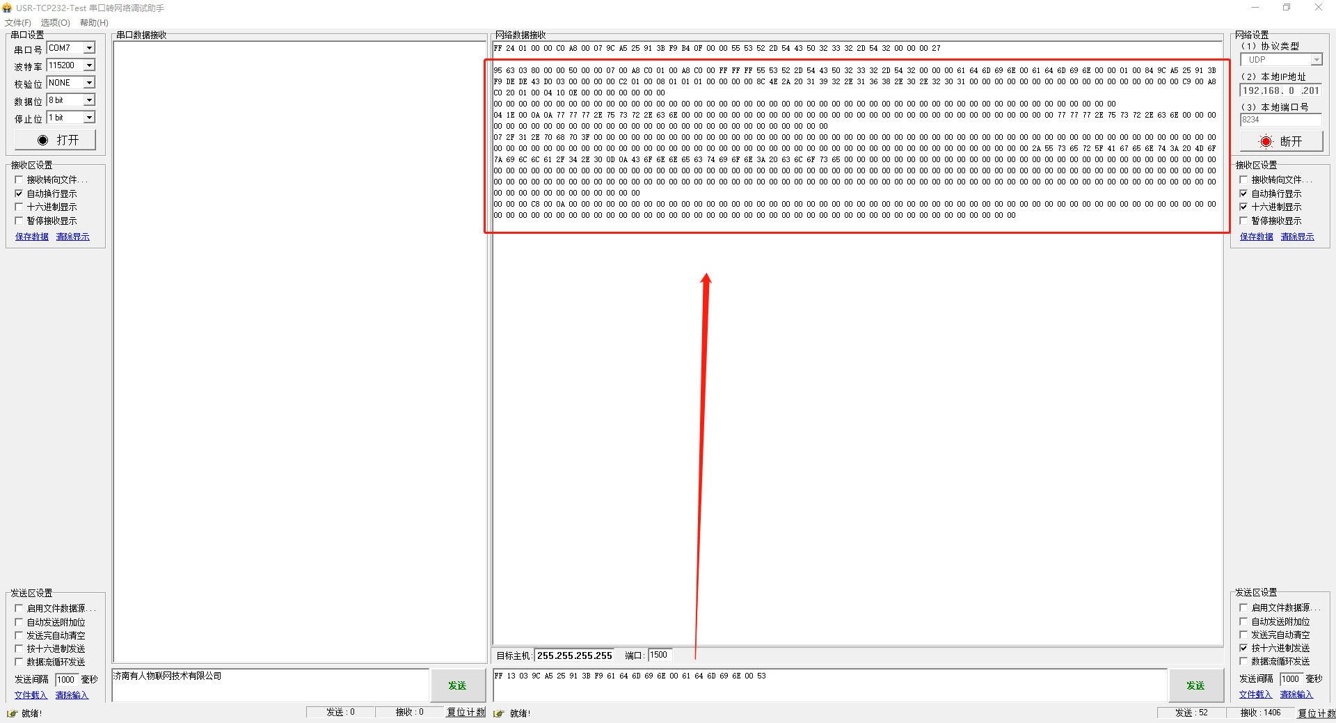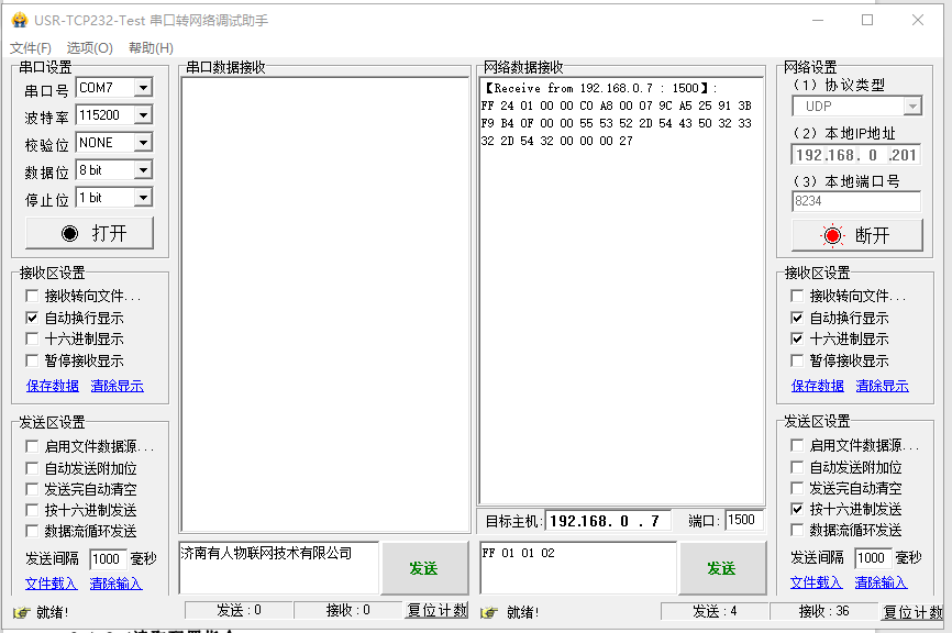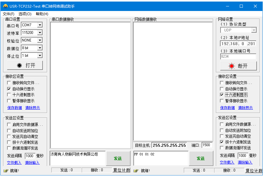 (1)網絡端勾選按十六進制發送,輸入搜索指令,FF 01 01 02