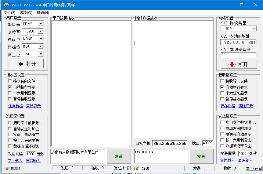 2、打開網絡助手,建立UDP連接,本地IP填電腦IP 192.168.0.201 本地端口號填23