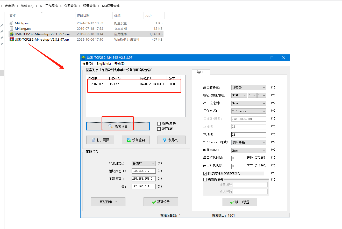 USR-K7和電腦網線直連,打開M4軟件,搜到USR-K7的IP。