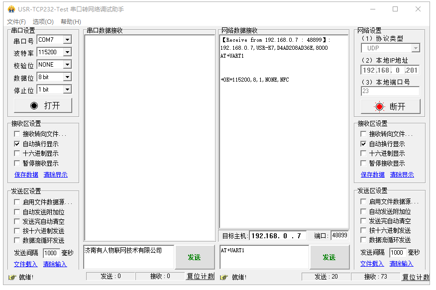 4、收到USR-K7 IP信息后,30s 內網絡端發送AT+UART1,后面帶回車換行發送,網絡端返回AT指令內容。