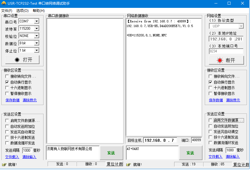 4、收到USR-K5 IP信息后,30s 內網絡端發送AT+UART,后面帶回車換行發送,網絡端返回AT指令內容。