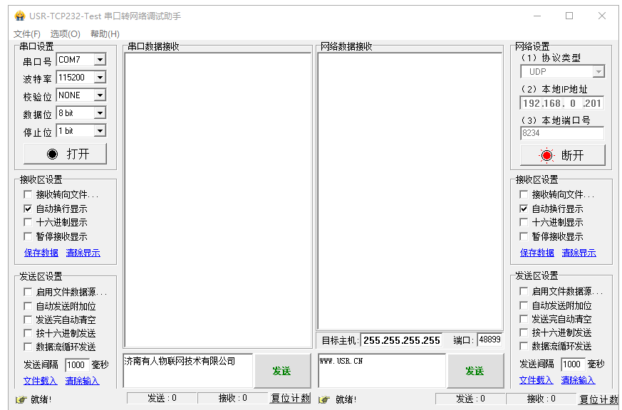 2、打開網絡助手,建立UDP連接,本地IP填電腦IP 192.168.0.201 本地端口號填8234