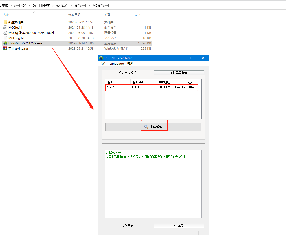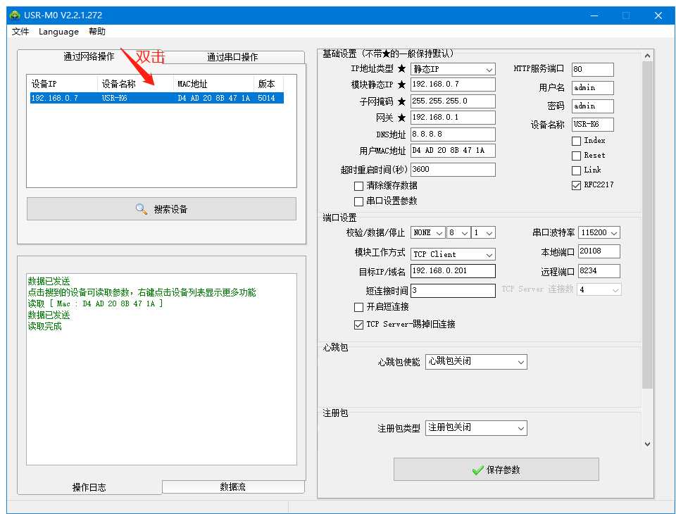 USR-K6和電腦網線直連,打開M4軟件,搜到USR-K6的IP。