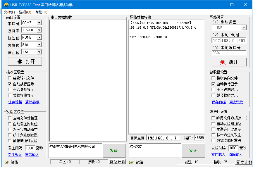 4、收到USR-K6 IP信息后,30s 內網絡端發送AT+UART,后面帶回車換行發送,網絡端返回AT指令內容。
