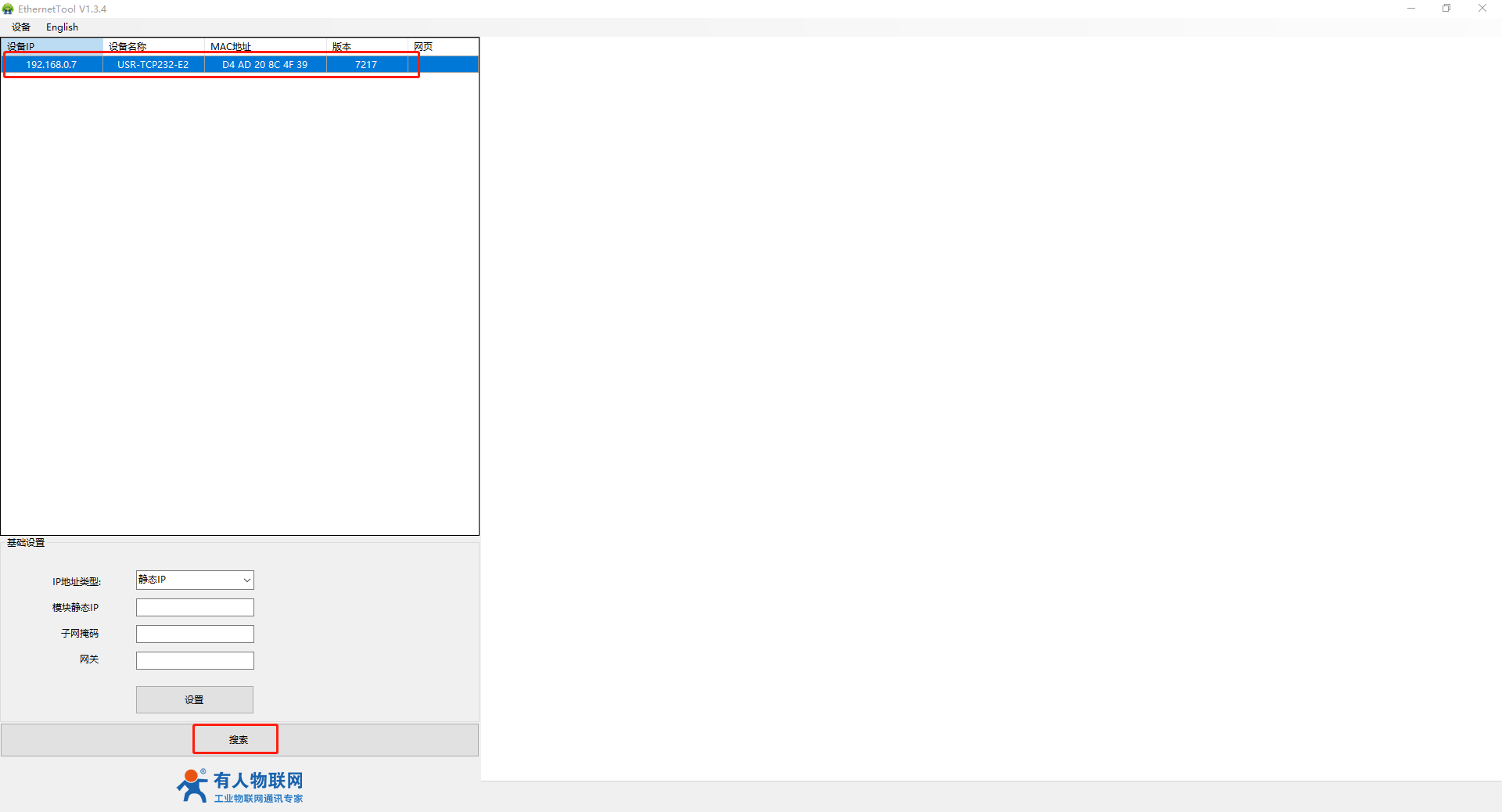 USR-TCP232-E2和電腦網(wǎng)線直連,打開(kāi)H7軟件,搜到USR-TCP232-E2的IP。