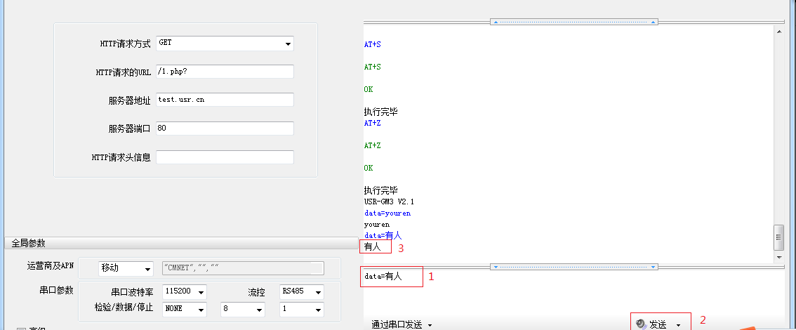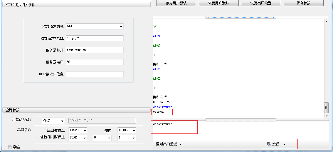 5、模塊設置參數:打開設置軟件,模塊設置為Httpd Client模式,請求方式GET,URL為/1.php?,設置服務器地址test.usr.cn,端口80,設置并保存所有參數,重啟模塊。(本說明文檔使用為有人測試服務器)