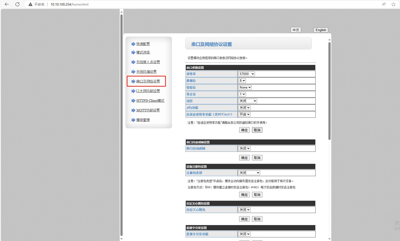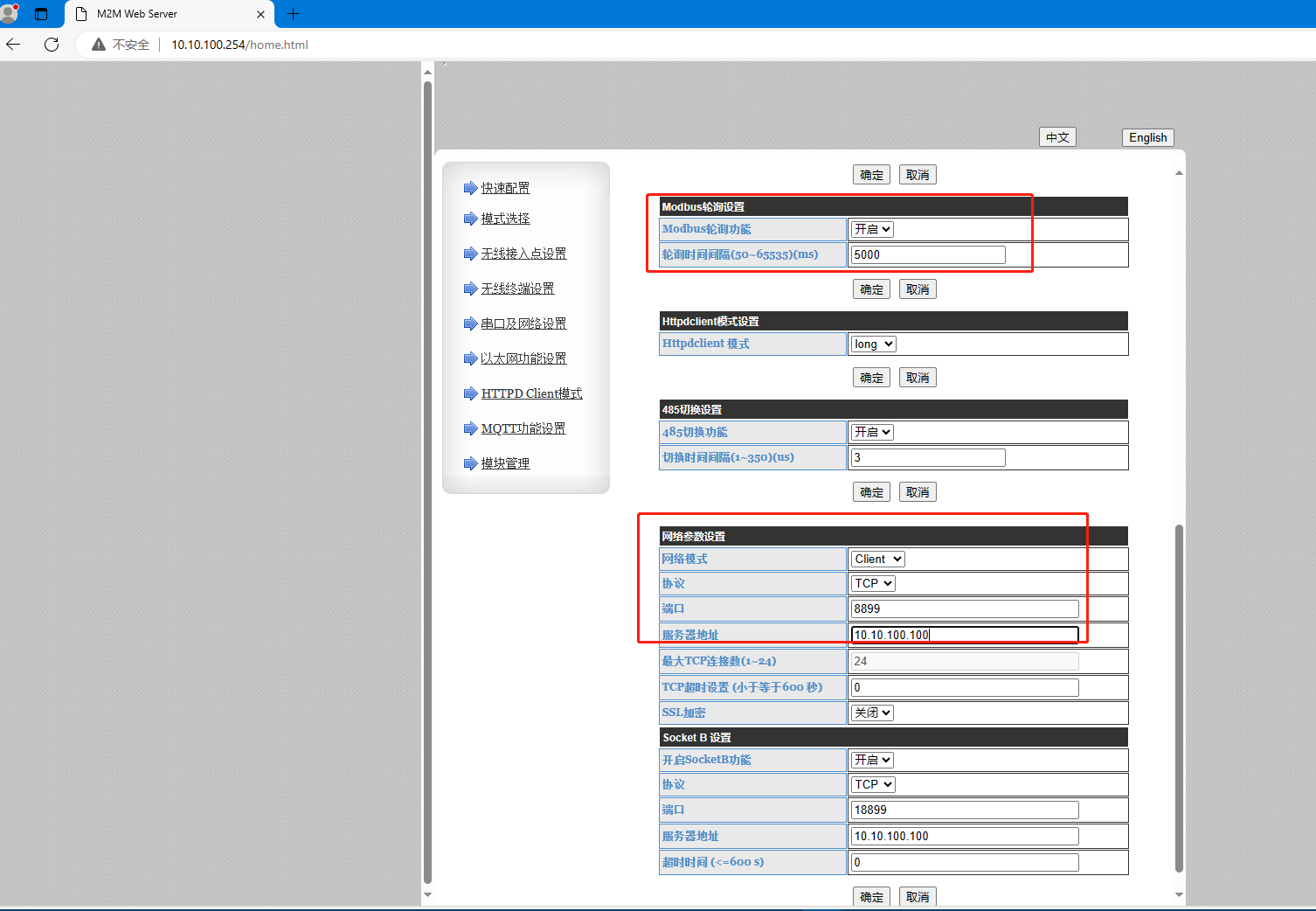 網(wǎng)頁上設(shè)置AP模式,開啟MODBUS TCP轉(zhuǎn)MODBUS RTU模式,點(diǎn)擊確定。