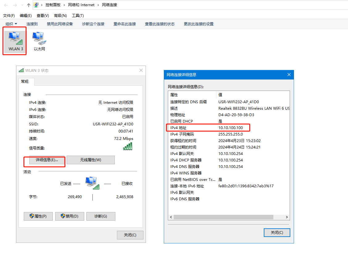 電腦連接USR-W610的WiFi之后,查看電腦本地網(wǎng)卡IP是10.10.100.100