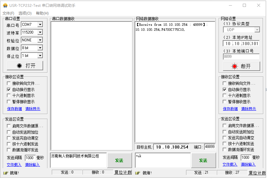 網絡數據接收到USR-WIFI232-B2的IP和MAC,收到IP和MAC后,立刻發送+ok(不帶回車發送),發送完就是進入網絡AT指令,可以發送USR-WIFI232-B2的AT指令,去查詢參數。