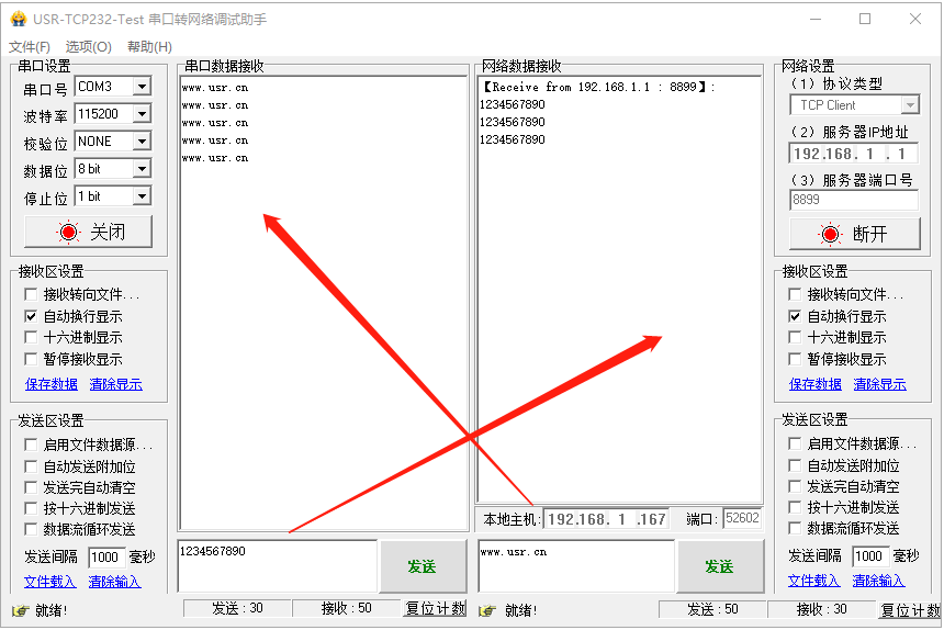 3、測(cè)試串口端向網(wǎng)絡(luò)端發(fā)送數(shù)據(jù),網(wǎng)絡(luò)端也可以向串口端發(fā)送數(shù)據(jù)。