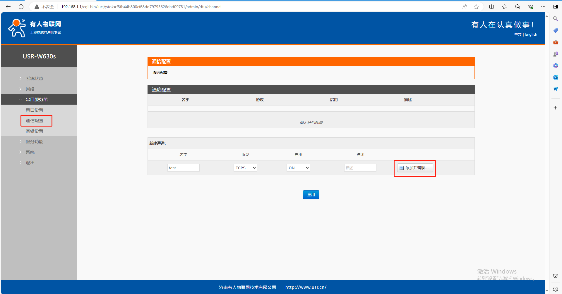 (1)通信配置,新建通道,協(xié)議TCPS,啟用ON,點(diǎn)擊添加并編輯。