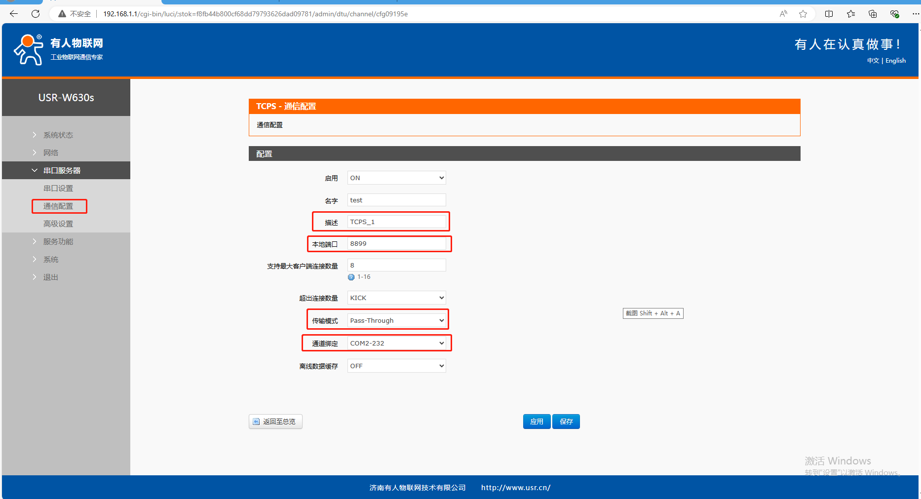 (2)跳轉(zhuǎn)到TCPS-通信配置頁面,本地端口設(shè)置8899,傳輸模式選擇Pass-Through,通道綁定選擇COM2-232。點(diǎn)擊應(yīng)用。