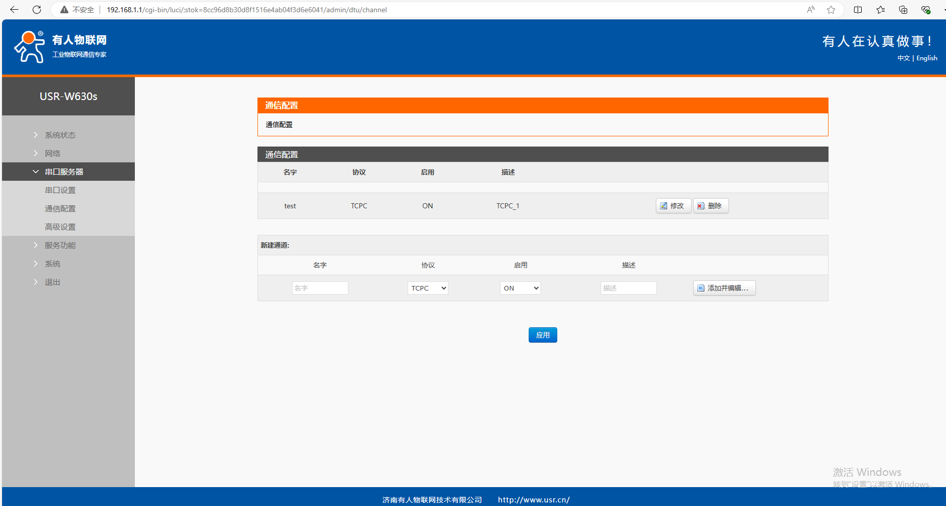 注意:實際應(yīng)用,根據(jù)USR-W630s實際使用的串口,修改串口參數(shù),和所接串口設(shè)備的串口參數(shù)保持一致。如果修改參數(shù),需要點擊應(yīng)用。