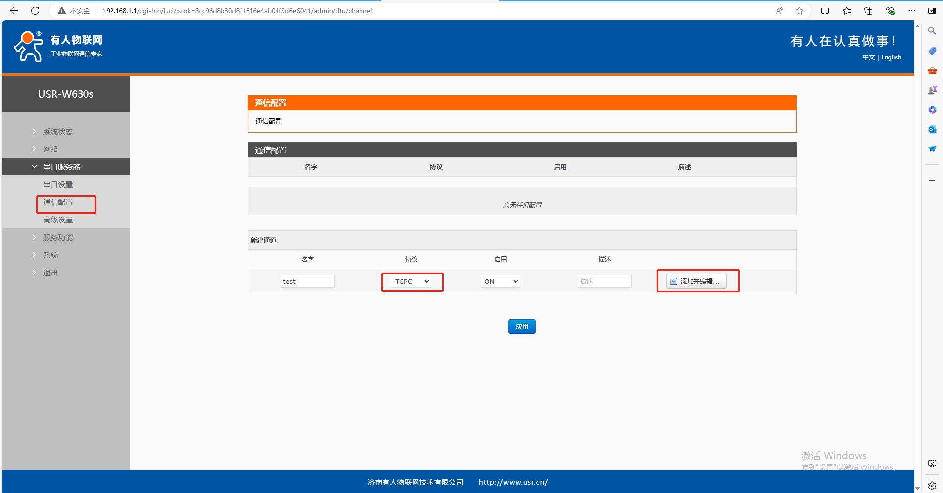 (1)通信配置,新建通道,協(xié)議TCPC,啟用ON,點擊添加并編輯。