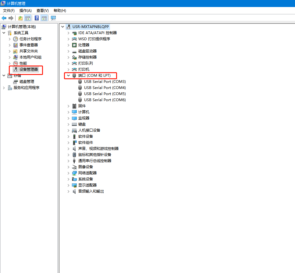 電腦鼠標點擊計算機管理,右擊,點開設備管理器,點擊端口,查看接USR-W630s的USB-RS232串口線COM口號,COM3。