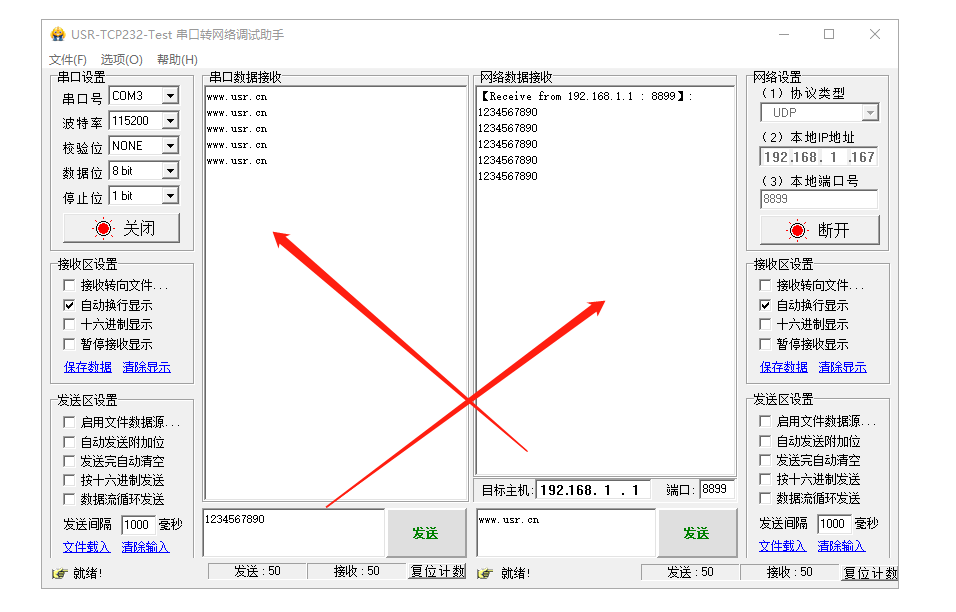 3、測試數據通訊,可以先網絡端向串口端發送數據,串口端再向網絡端發送數據,