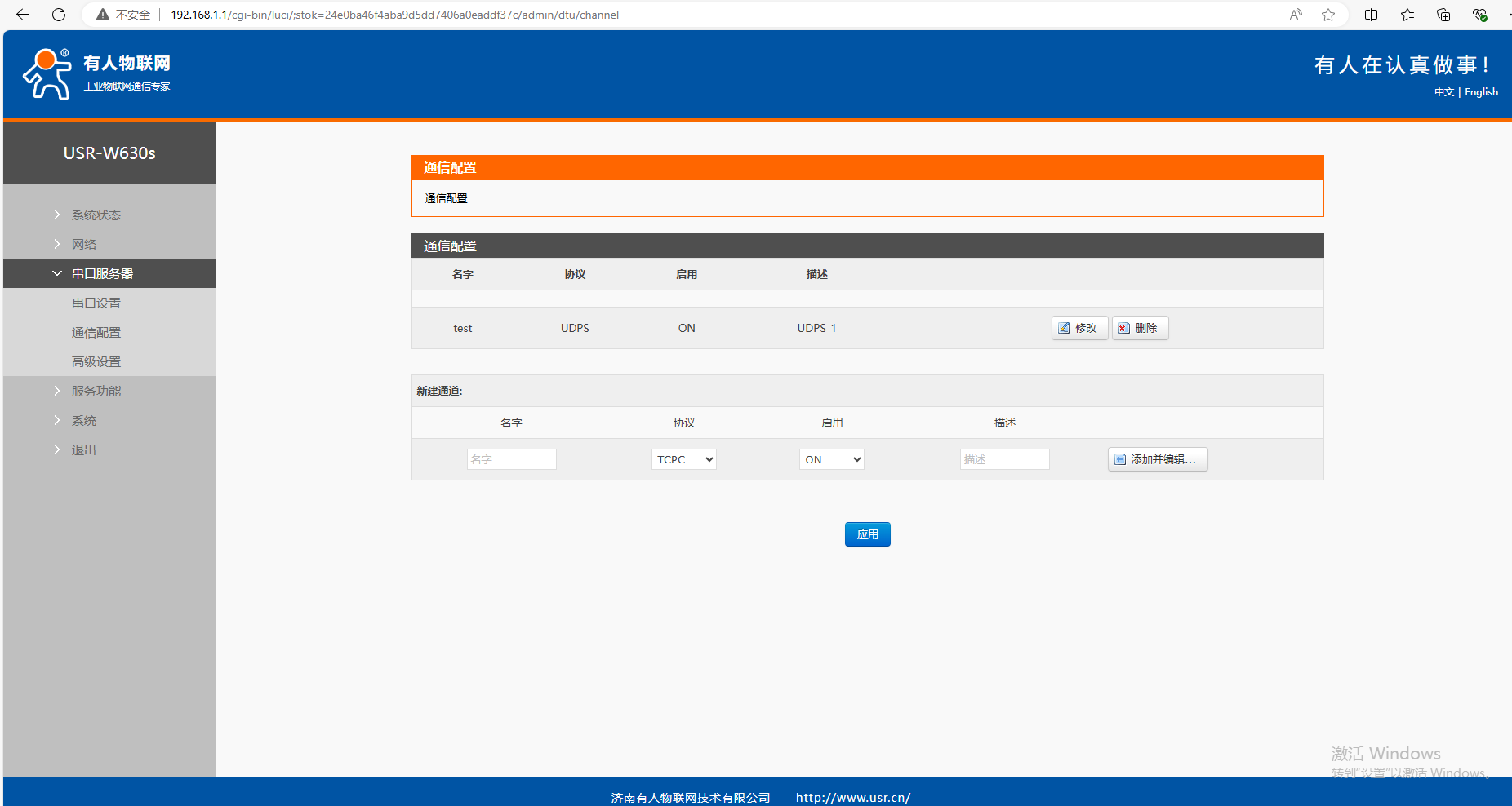 (1)通信配置,新建通道,協議UDPS,啟用ON,點擊添加并編輯。