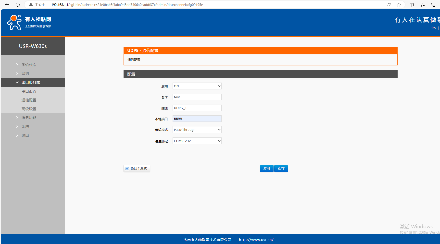 (2)跳轉(zhuǎn)到UDPS-通信配置頁面,本地端口設置8899,傳輸模式選擇Pass-Through,通道綁定選擇COM2-232。點擊應用。
