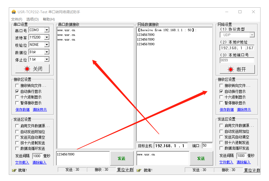 3、測試數據通訊,可以先網絡端向串口端發送數據,串口端再向網絡端發送數據,