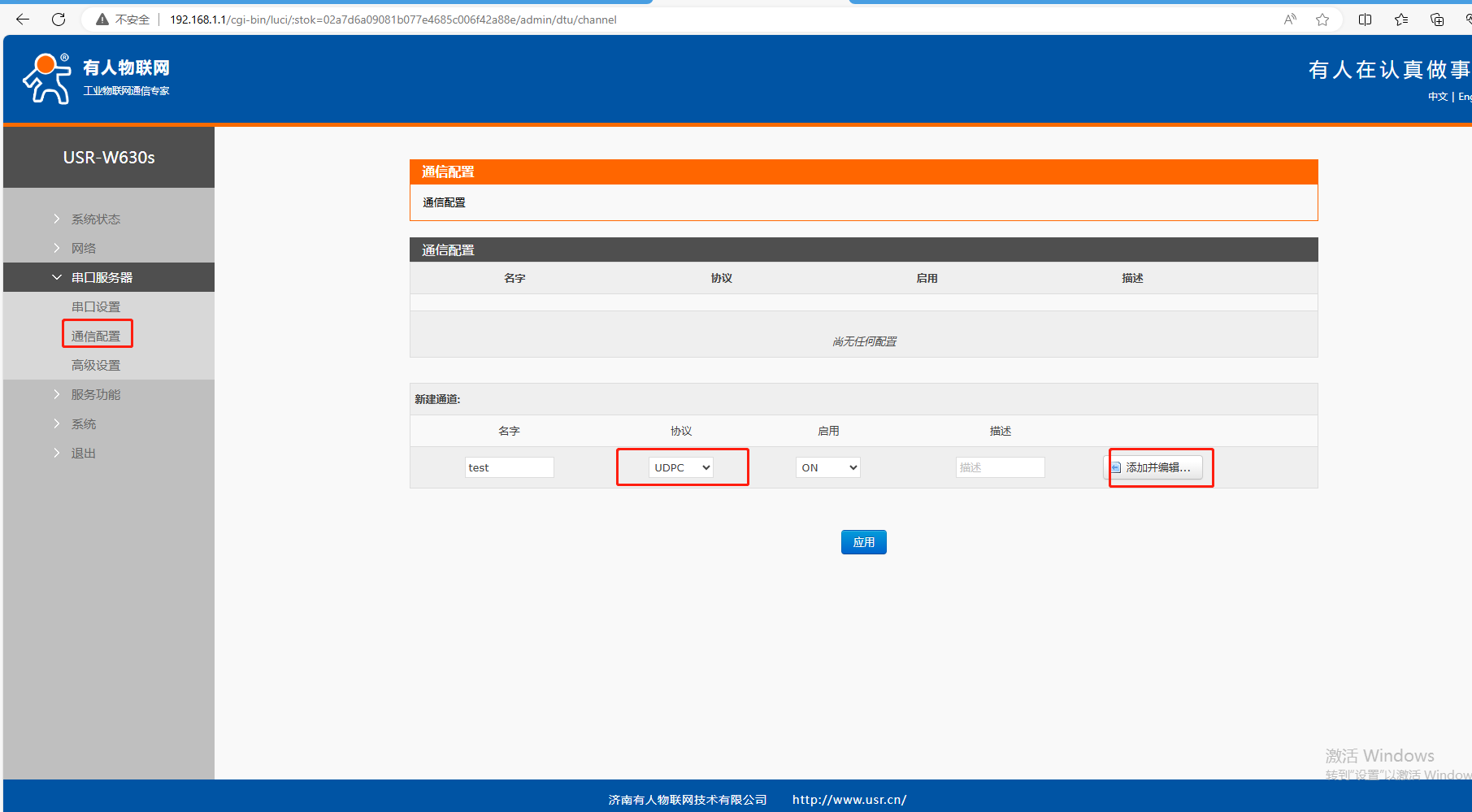 (1)通信配置,新建通道,協議UDPC,啟用ON,點擊添加并編輯。