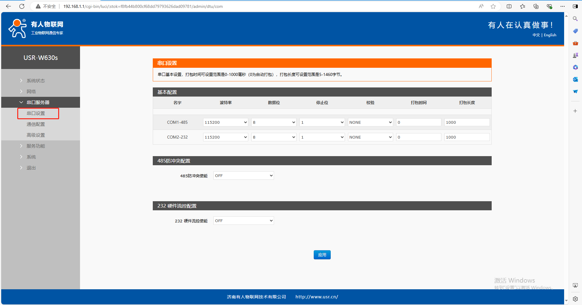 注意:實際應用,根據USR-W630s實際使用的串口,修改串口參數,和所接串口設備的串口參數保持一致。如果修改參數,需要點擊應用。