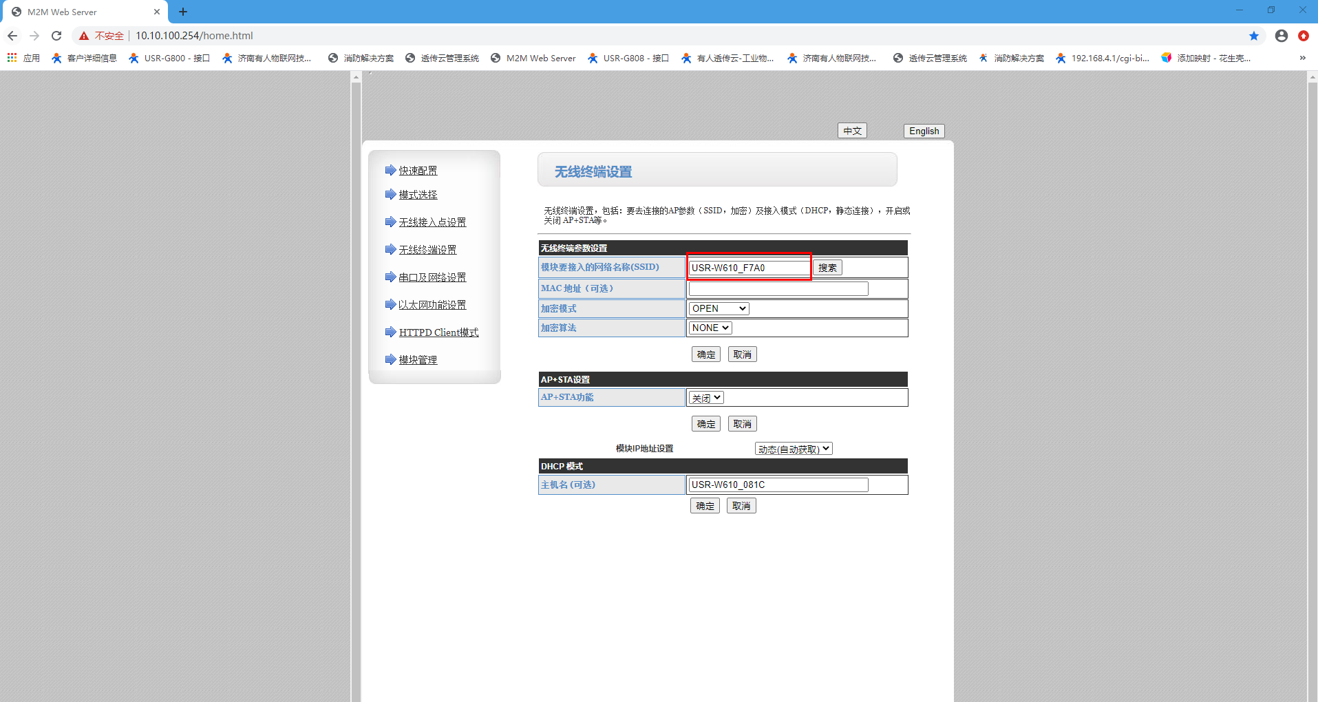 3、設(shè)置STA模式,無線終端,輸入模塊要連接的網(wǎng)絡(luò)名稱USR-W610_F7A0。以太網(wǎng)功能設(shè)置,開啟網(wǎng)口,選擇LAN口,網(wǎng)口模式選擇Z橋接模式。無線接入點(diǎn)IP設(shè)置10.10.100.253。每設(shè)置一項(xiàng)參數(shù),對(duì)應(yīng)點(diǎn)擊下面的確定,最后網(wǎng)頁重啟USR-W610。