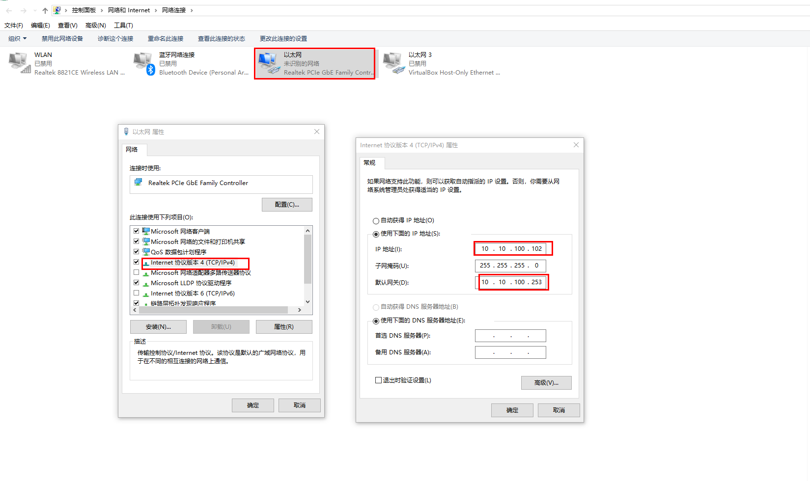 4、打開第2臺(tái)電腦的控制面板,將以太網(wǎng)卡設(shè)置靜態(tài)IP,IPv4設(shè)置10.10.100.102,子網(wǎng)掩碼255.255.255.0,默認(rèn)網(wǎng)關(guān)10.10.100.253,點(diǎn)擊確定。