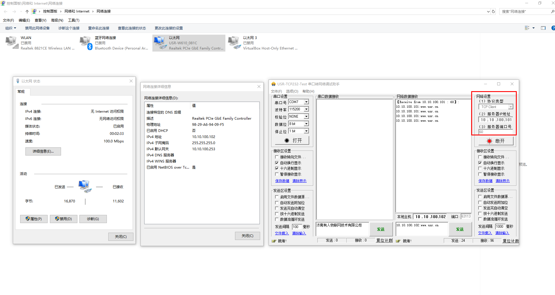 2、第一個(gè)電腦打開網(wǎng)絡(luò)調(diào)試助手做TCP server,第二臺(tái)電腦打開網(wǎng)絡(luò)調(diào)試助手做TCP client,可以建立TCP連接,可以相互發(fā)送數(shù)據(jù)。