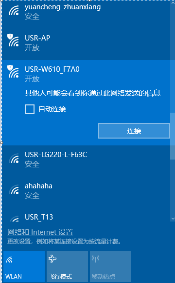 1、禁用其他網(wǎng)卡,保留無線網(wǎng)卡,電腦搜索第一個(gè)USR-W610的WiFi名稱USR-W610_F7A0,并連接。