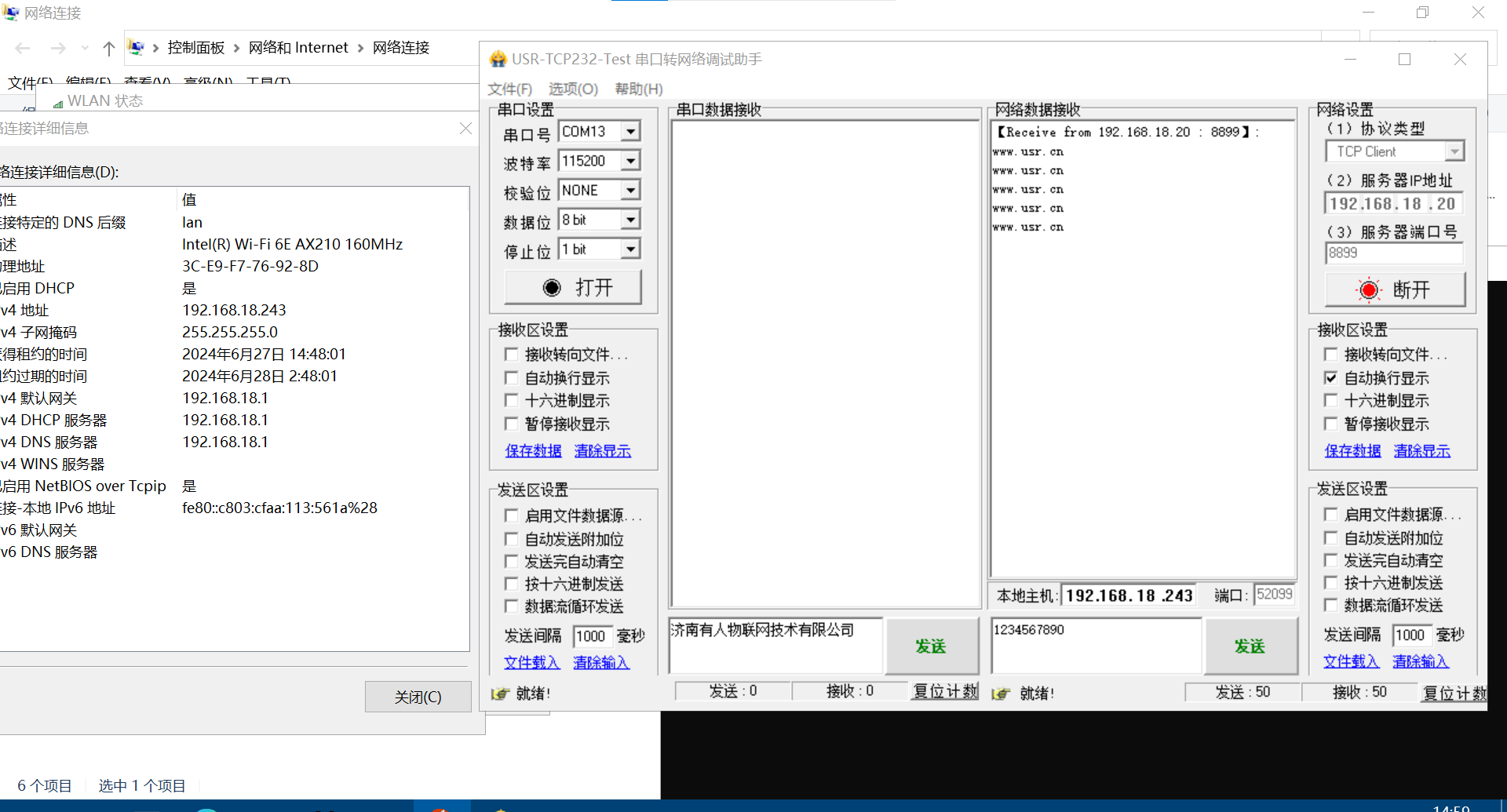 (3)建立TCP連接之后,2個網絡端,網絡助手可以相互發送數據。
