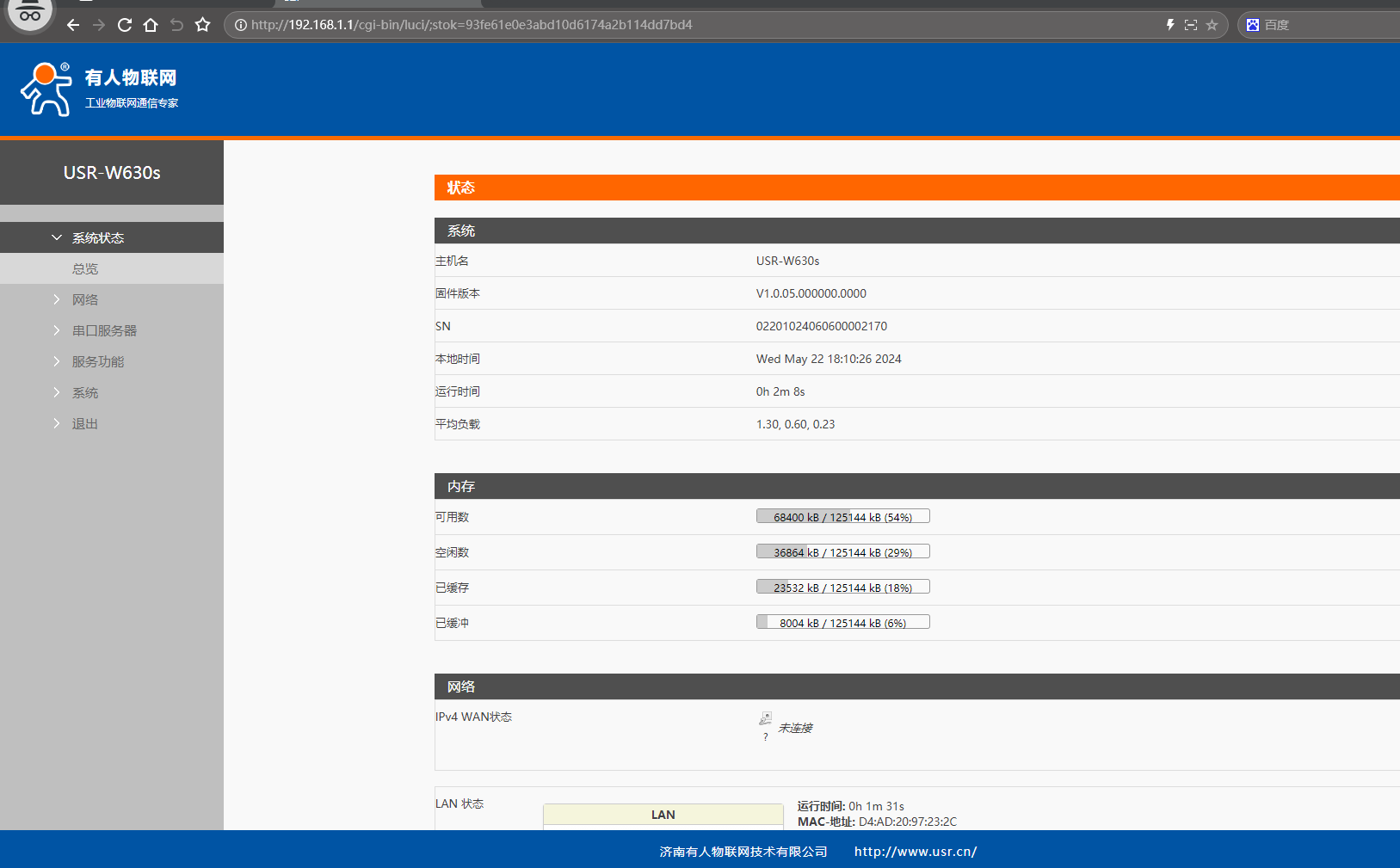(2)瀏覽器輸入USR-W630s 修改后的LAN口IP,192.168.18.127,可以點擊總覽查看網絡信息,可以點開無線客戶端,熱點信息,查看連接的路由器信息。
