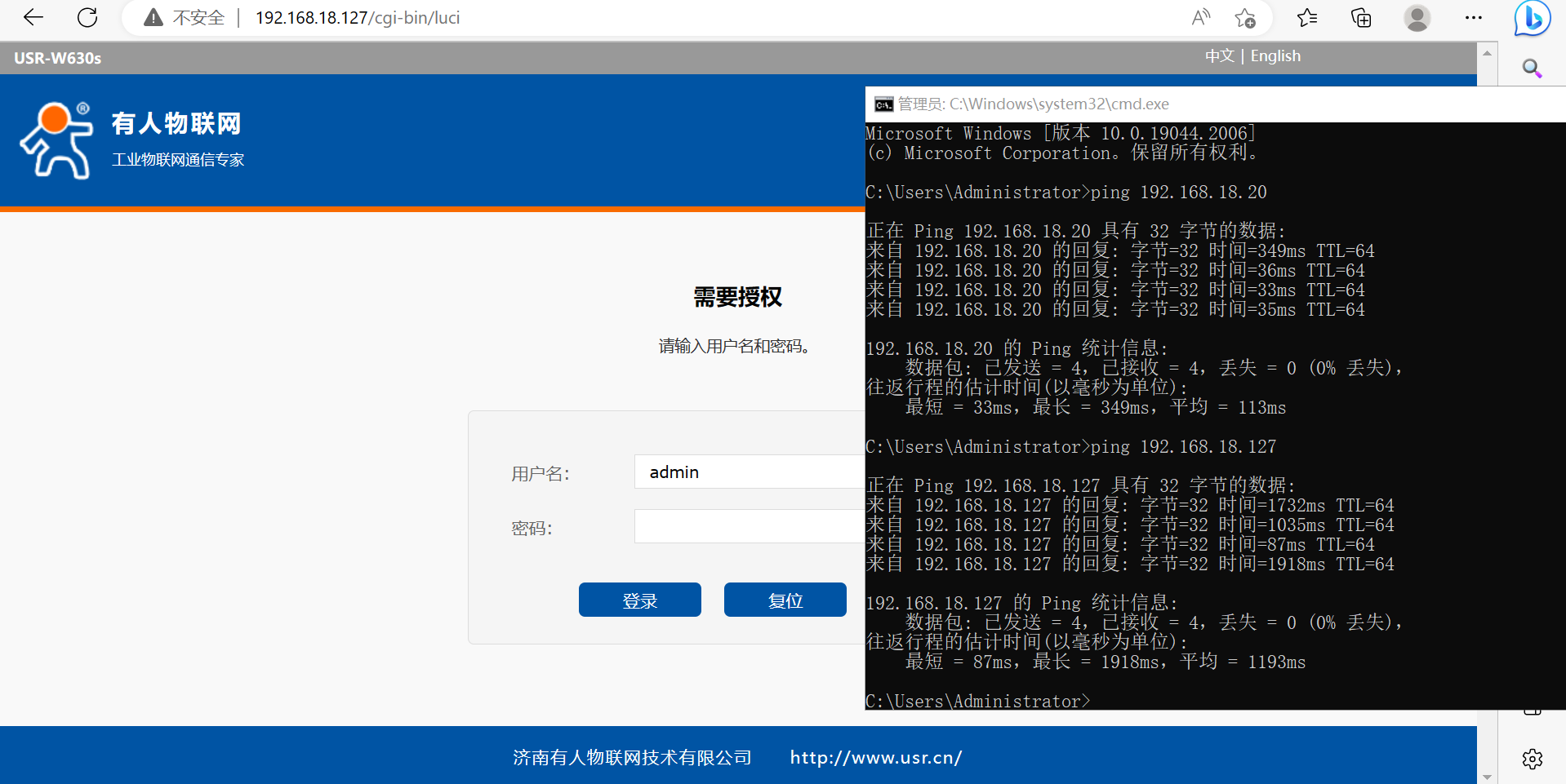 (1)STA連接路由器的USR-W630s LAN接第一臺電腦,第一臺電腦去PING 無線連接路由器的第二臺電腦IP 192.168.18.243。