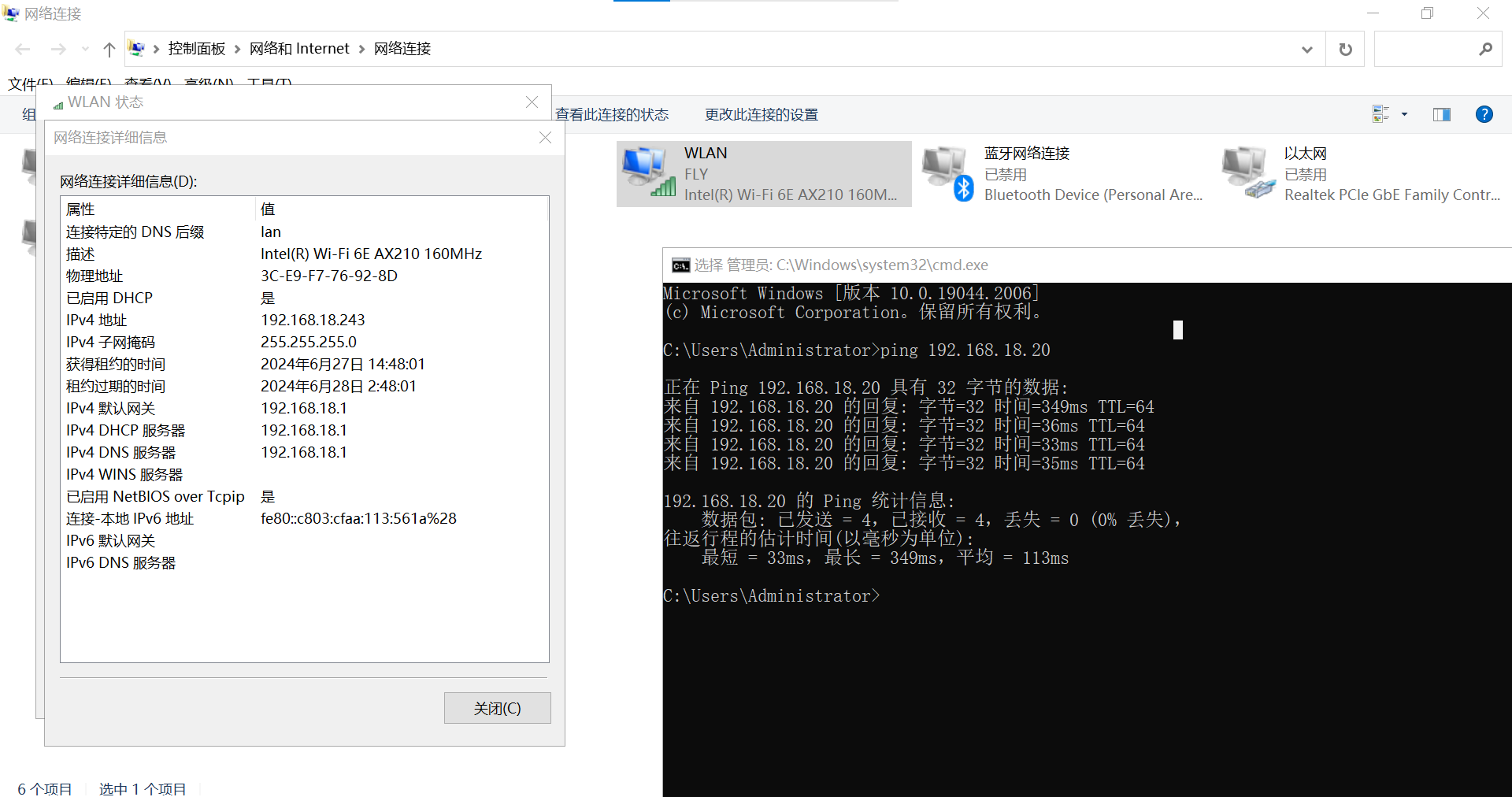 (1)第二臺電腦用網線連接路由器的LAN口或者無線連接路由器WiFi,本案例是用無線連接路由器WiFi,電腦無線網卡從路由器獲取的IP是192.168.18.243。