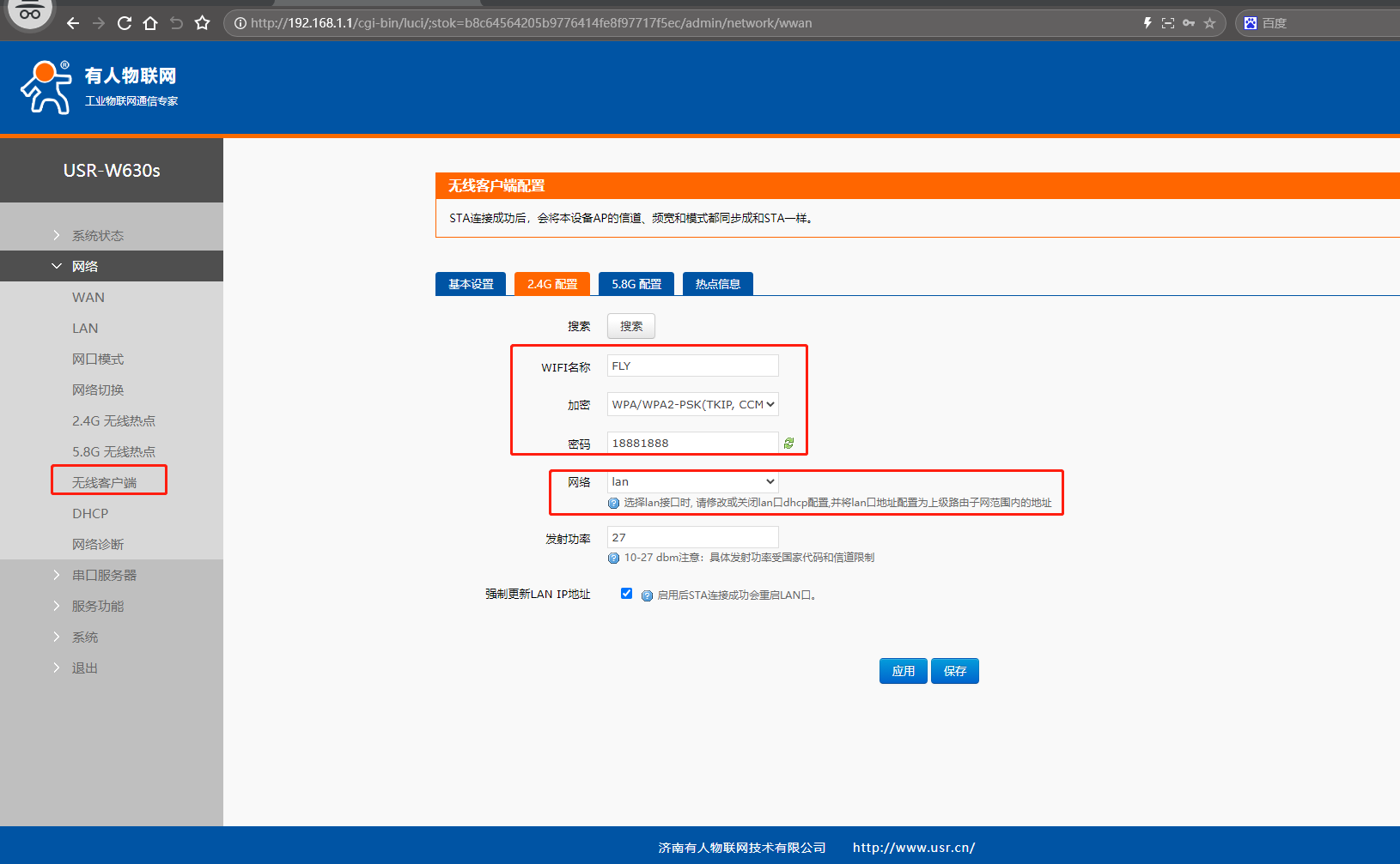 (2)點開網頁2.4G配置,填入STA模式要連接的路由器WiFi名稱FLY,填入路由器密碼,網絡選擇lan。注意選擇lan接口時,請修改或關閉lan口dhcp配置,并將lan口地址配置為上級路由子網范圍內的地址。點擊保存。