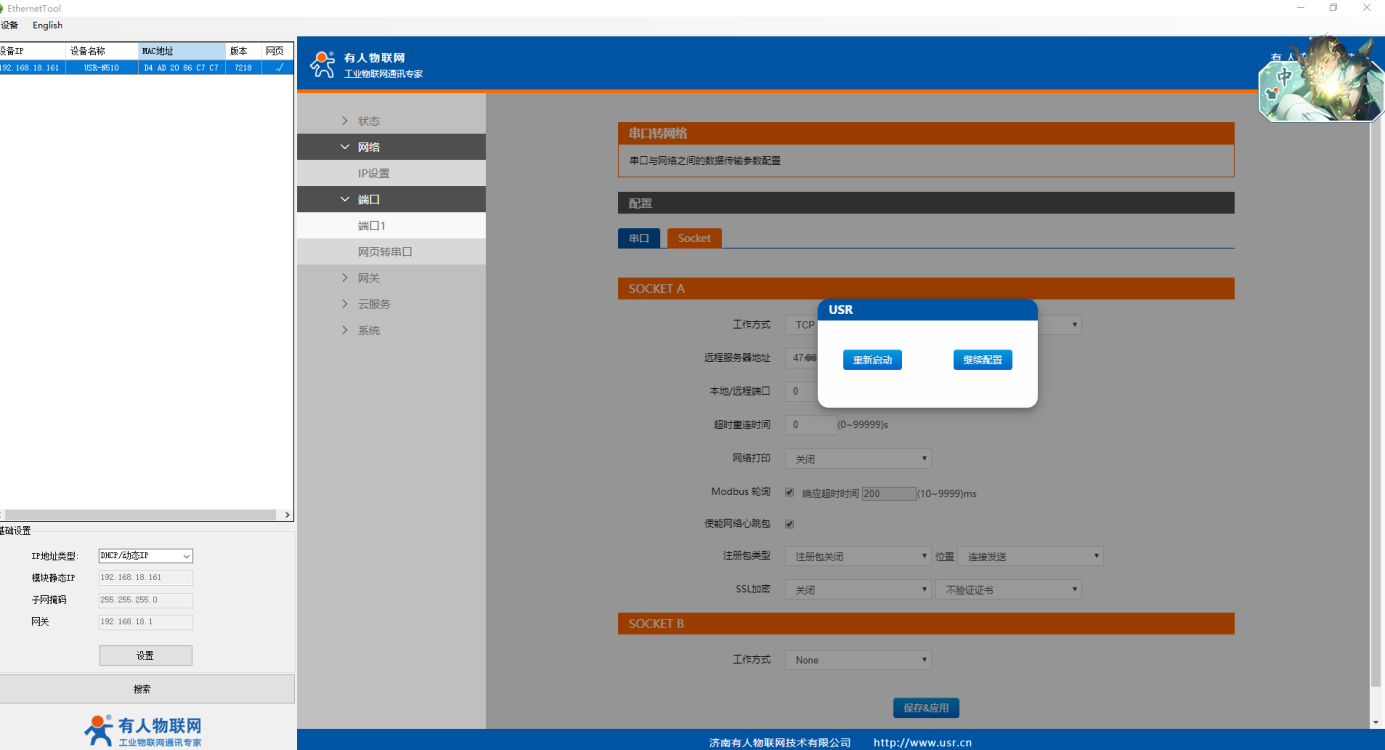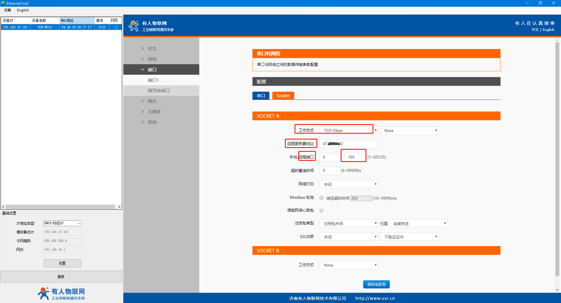 點擊Socket,SOCKET A的工作方式設置TCP client,遠程服務器地址填要連接的公網服務器IP(遠程服務器IP),遠程端口填公網服務器的端口,舉例用了端口100,點擊保存&應用。