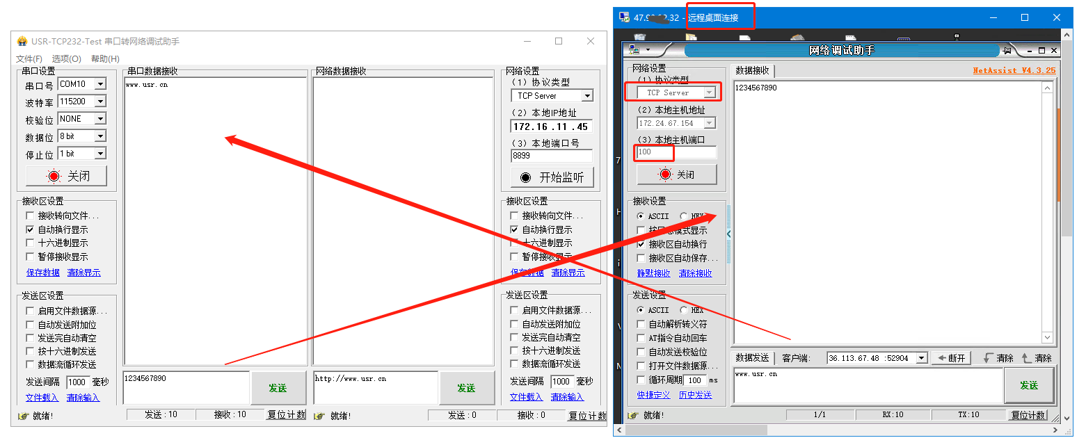 2、登陸公網服務器,打開遠程桌面連接,打開一個網絡助手,協議類型TCP server,服務器IP,本地端口100和N510一樣,點擊連接。