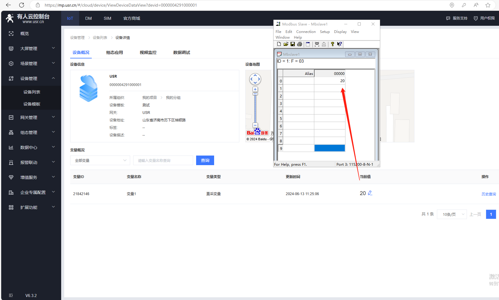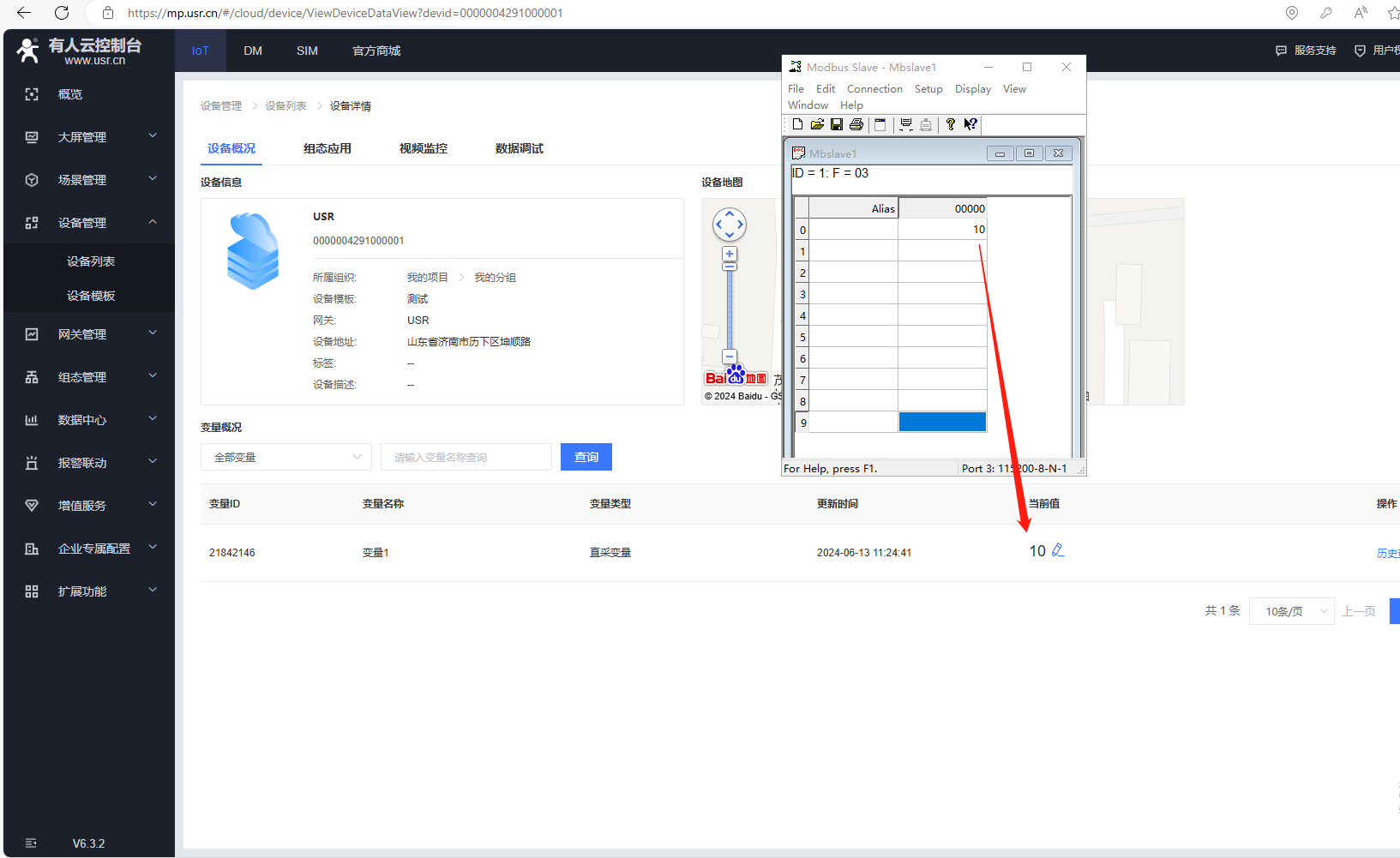 2、MODBUS slave數據設置10,有人云設備列表1分鐘采集,可以看到變量采集的當前值數據10。