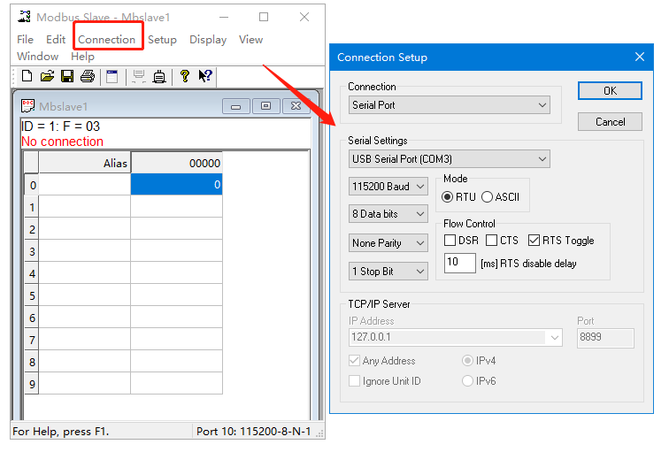 (2)點擊Connection,選擇串口,對應USR所接USB-RS232串口線的COM口號,串口參數和USR串口參數保持一致。 Mode選擇RTU,模擬MODBUS RTU協議串口。