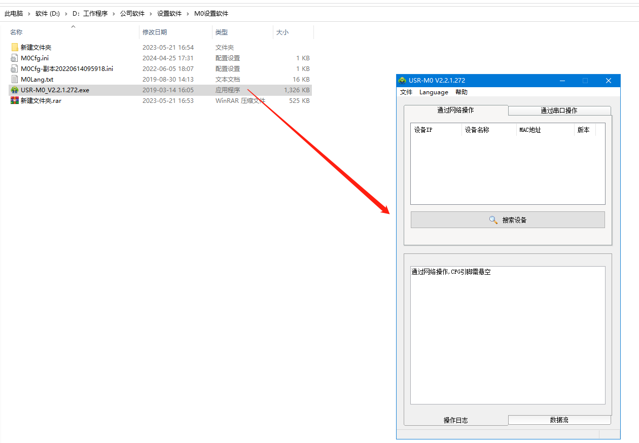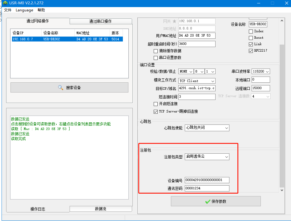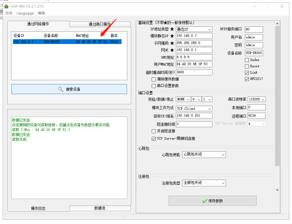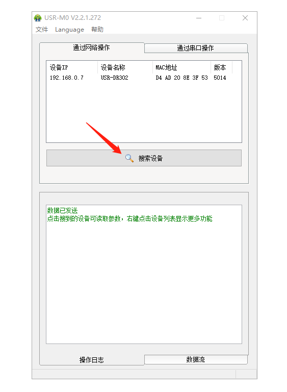3、點擊M0設置軟件搜索,搜到USR-DR302的IP