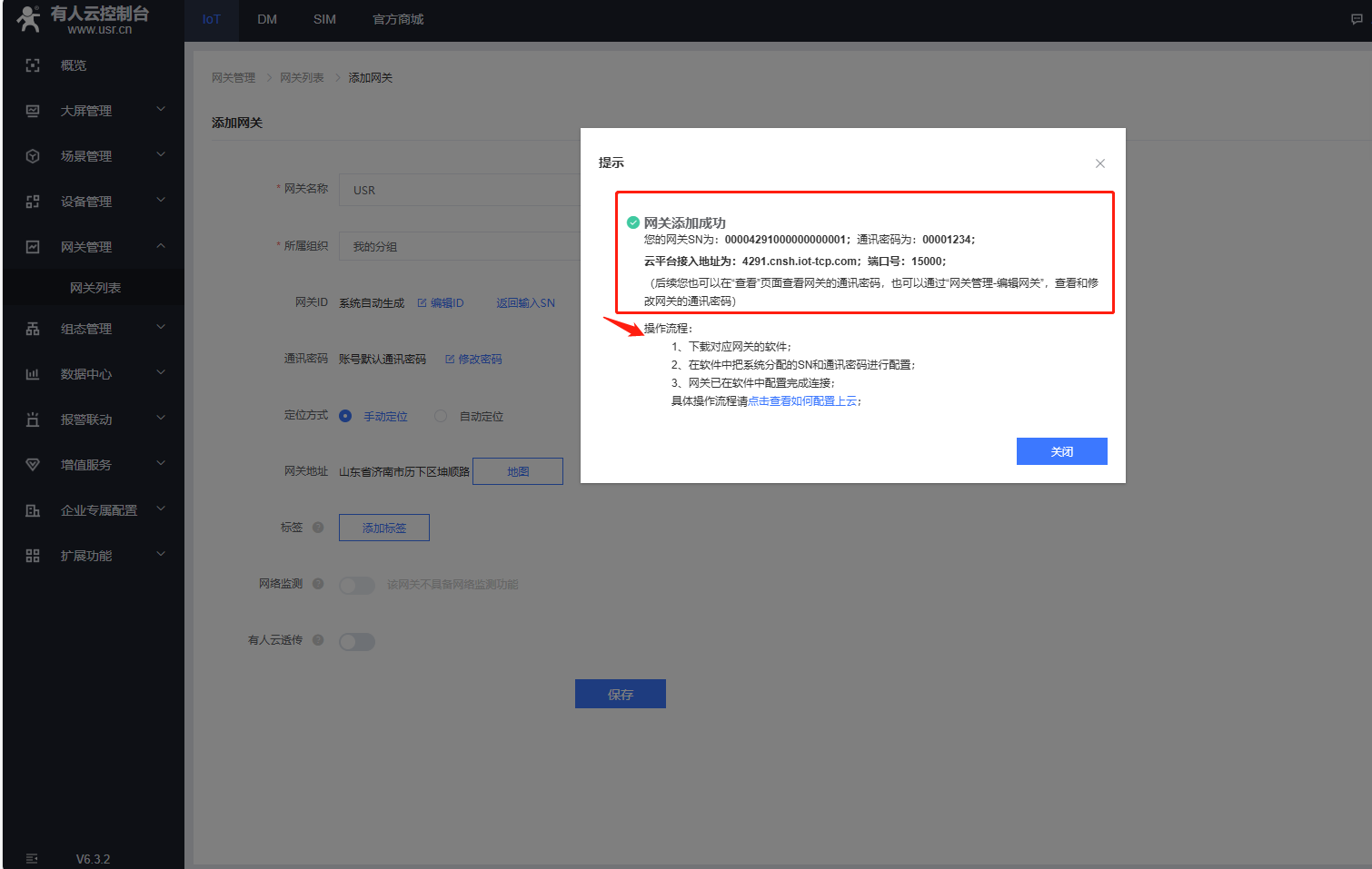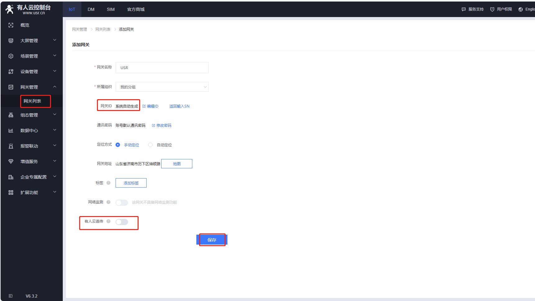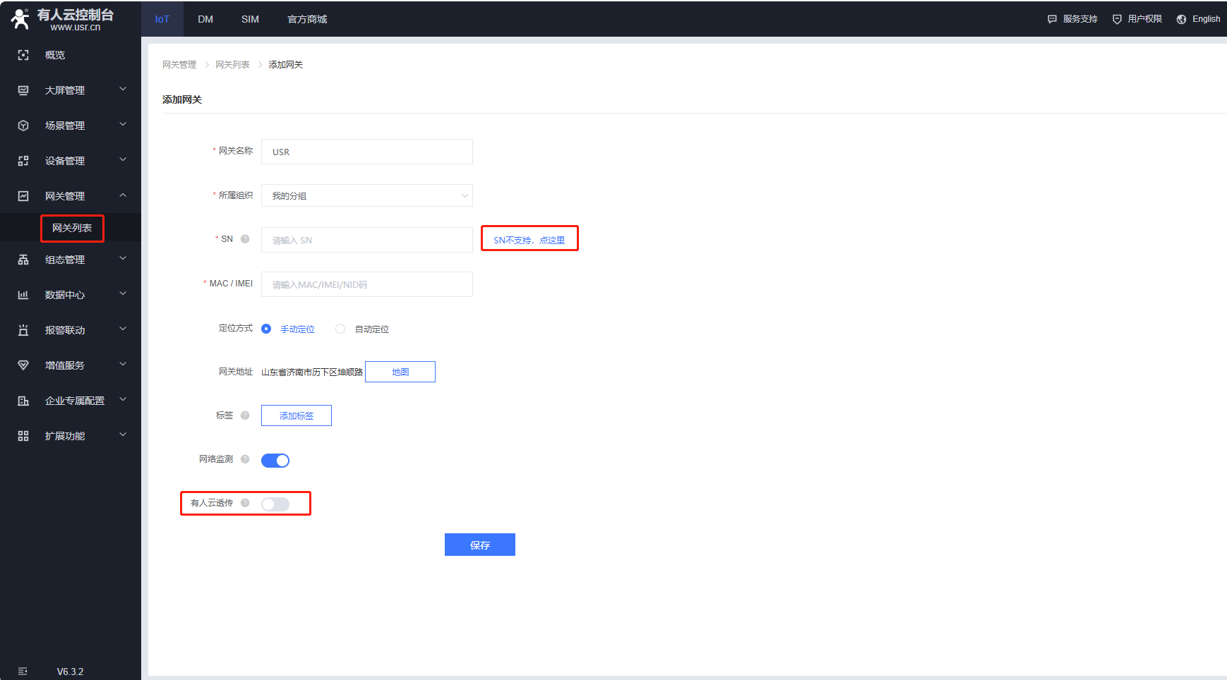 (2)USR-DR302不支持SN添加有人云的產品,在有人云添加網關的時候,點擊SN不支持點這里,自動生成ID和密碼,有人云透傳需要關閉,最后點擊保存。