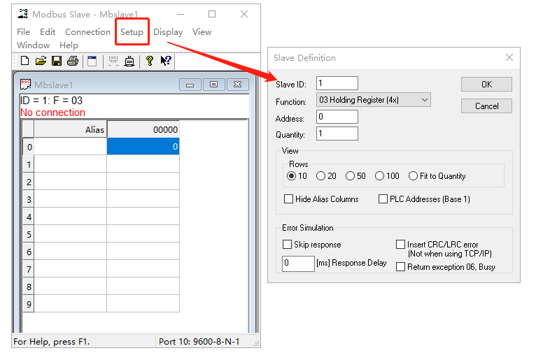 (1)點擊Setup,Slave ID從機地址用1,Function功能碼用03,Address寄存器起始地址用0,Quantity寄存器地址數量用1。