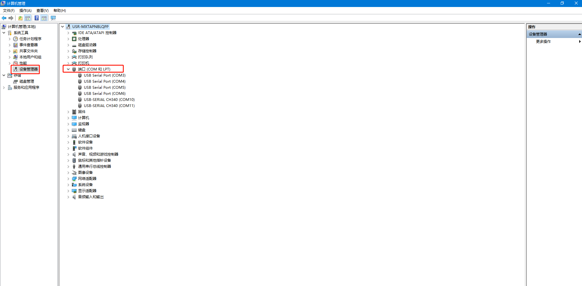 電腦鼠標點擊計算機管理,右擊,點開設備管理器,點擊端口,查看接USR的USB-RS485串口線COM口號,COM3。