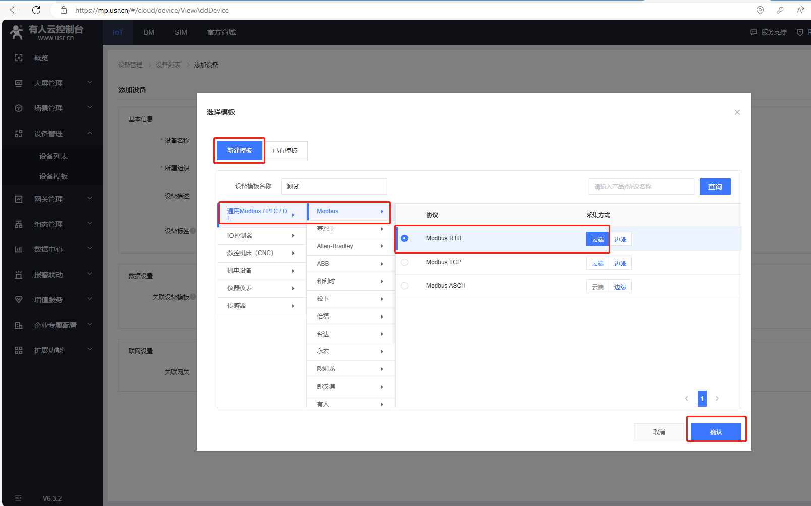 選擇新建模板,輸入設備模板名稱,通用Modbus/PLC/DL,選擇Modbus,協議選擇Modbus Rtu,采集方式云端,最后確認。